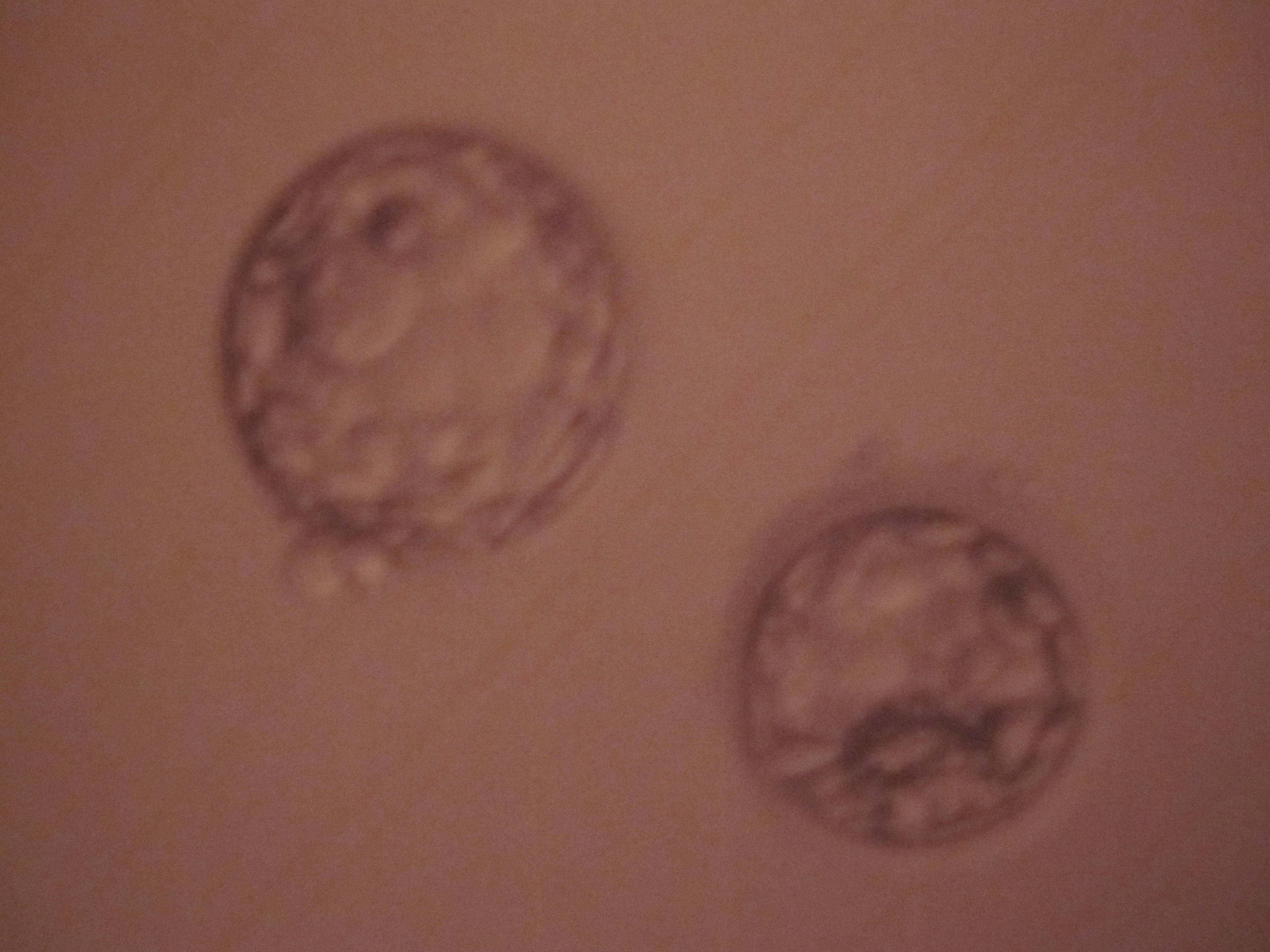 There was a TV monitor up on the ceiling so that I could see it perfectly from where I was laying. On the screen was an image of our two little embryos. It was amazing and surreal! THERE THEY WERE! One (or maybe two) of those little clusters will be our child someday.