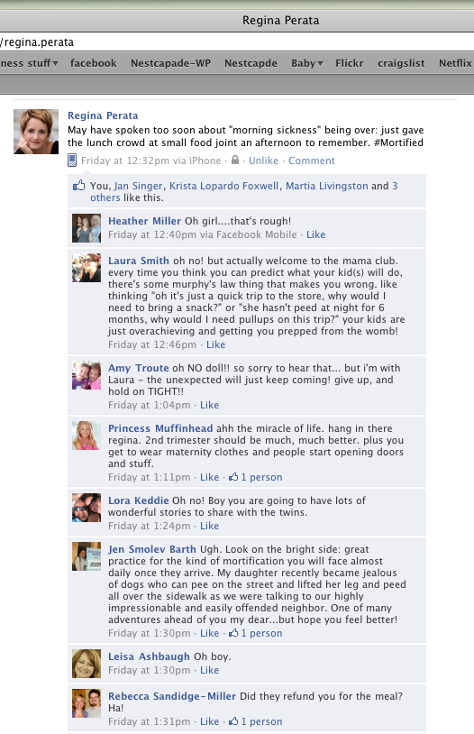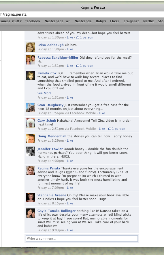So, yep, I hurled in a restaurant bathroom and everyone heard. Fortunately, Gina let them all know I’m pregnant but still, walking out of the bathroom only to stare into the faces of people having just heard me was a moment I’ll never forget.