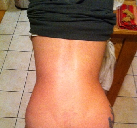 Sometimes I hang over the butcher block to get relief from the weight. Gina took this pic to show me that I still have a waist!