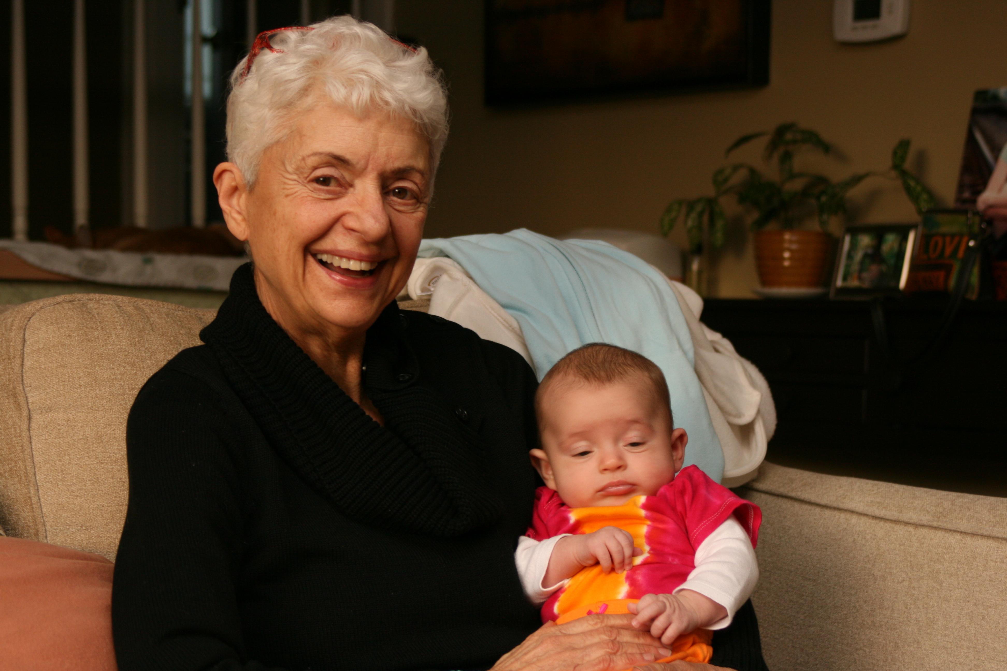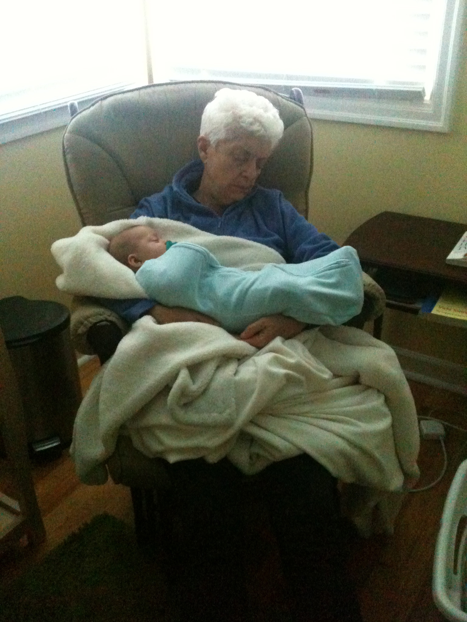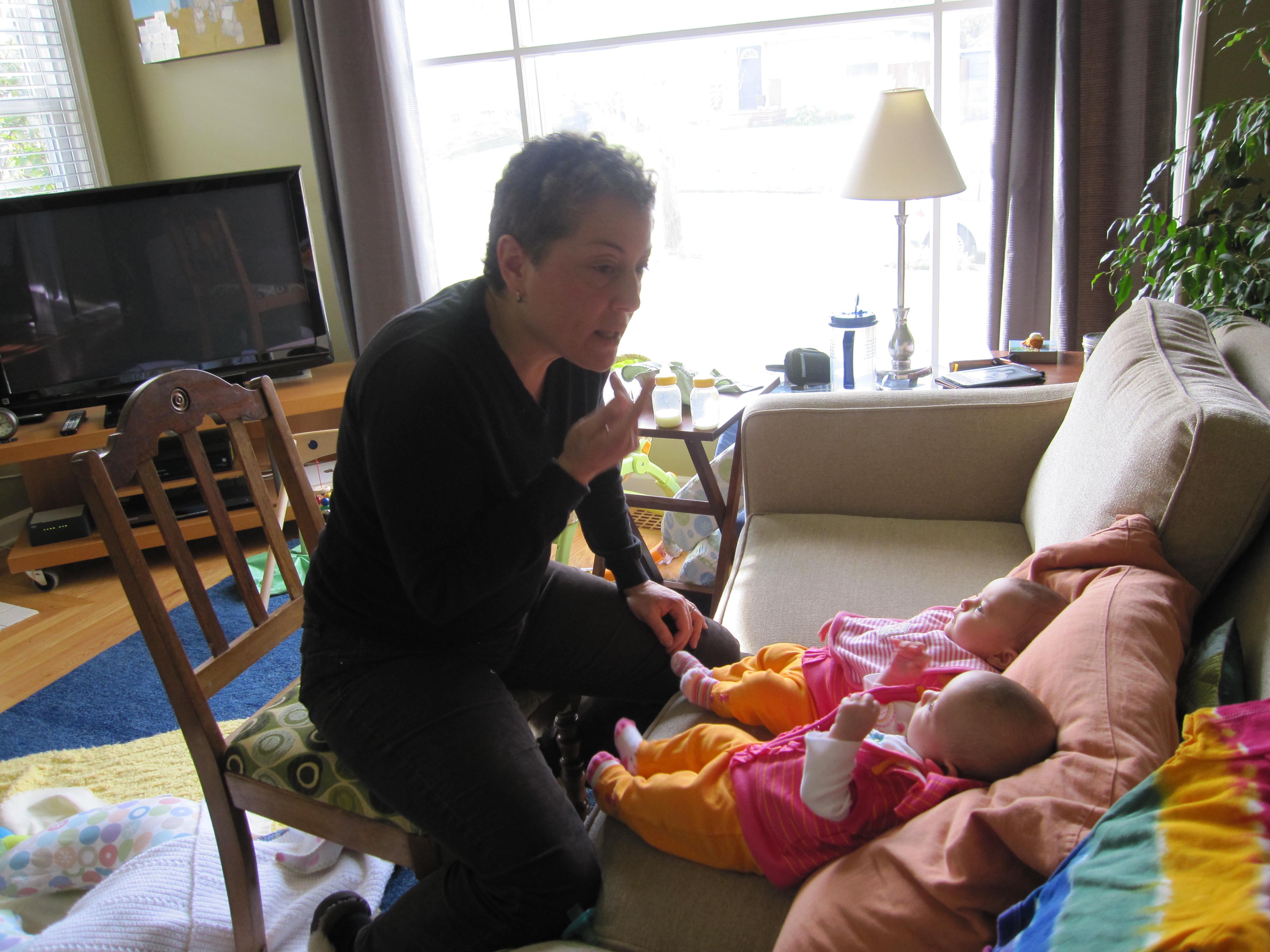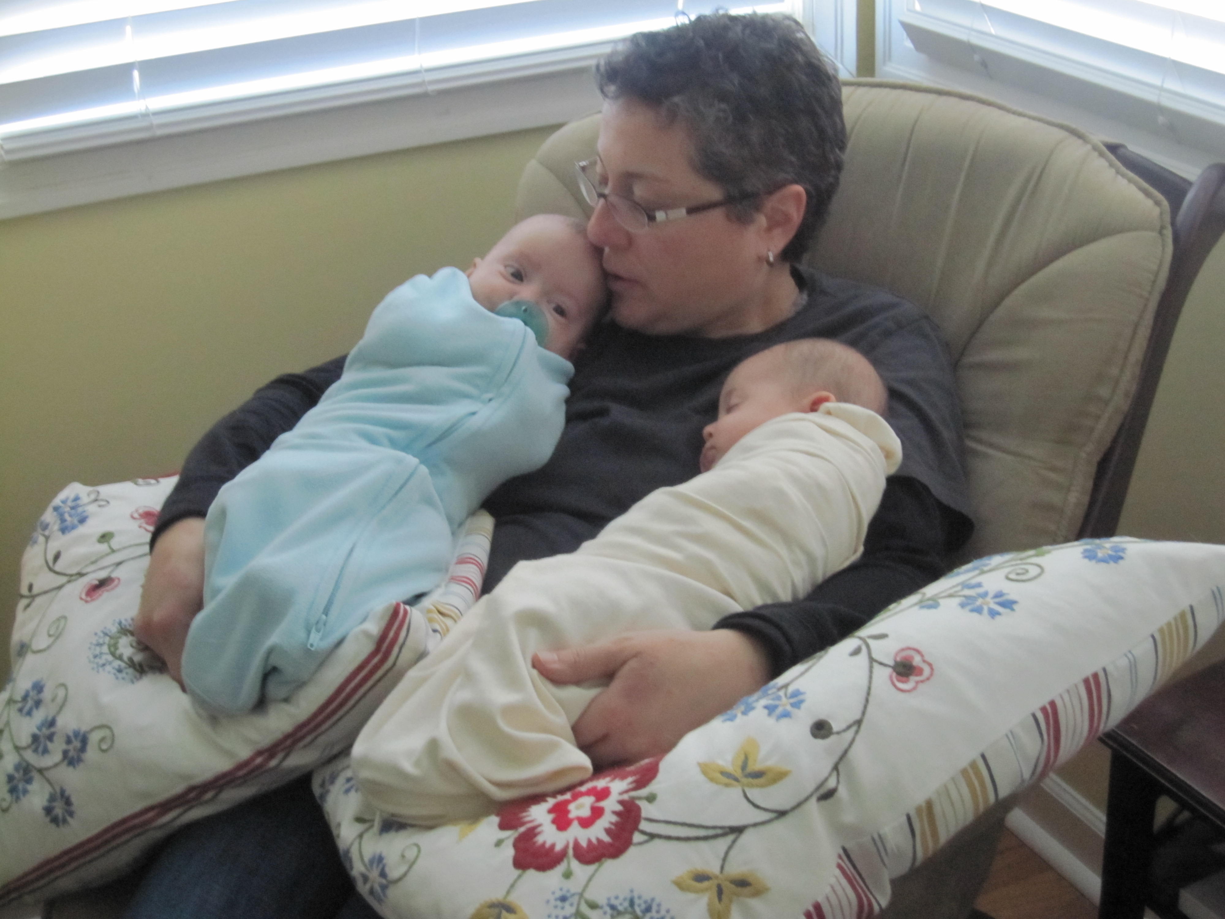 My mom’s visit was so sweet. It was healing for both of us and wonderful to see her so tickled and happy about the girls. She couldn’t stop saying, “They’re just so CUTE!” And they are of course. ☺ The thing that was sweetest to me was that they knew immediately she was family– important family. There was none of that stranger anxiety stuff. They just curled up in her lap and let her rock them for hours on end in the glider chair. They snuggled with her a lot and she seemed to have the magic touch in putting them to sleep by the end of the visit. It was sad to see them all have to say goodbye.