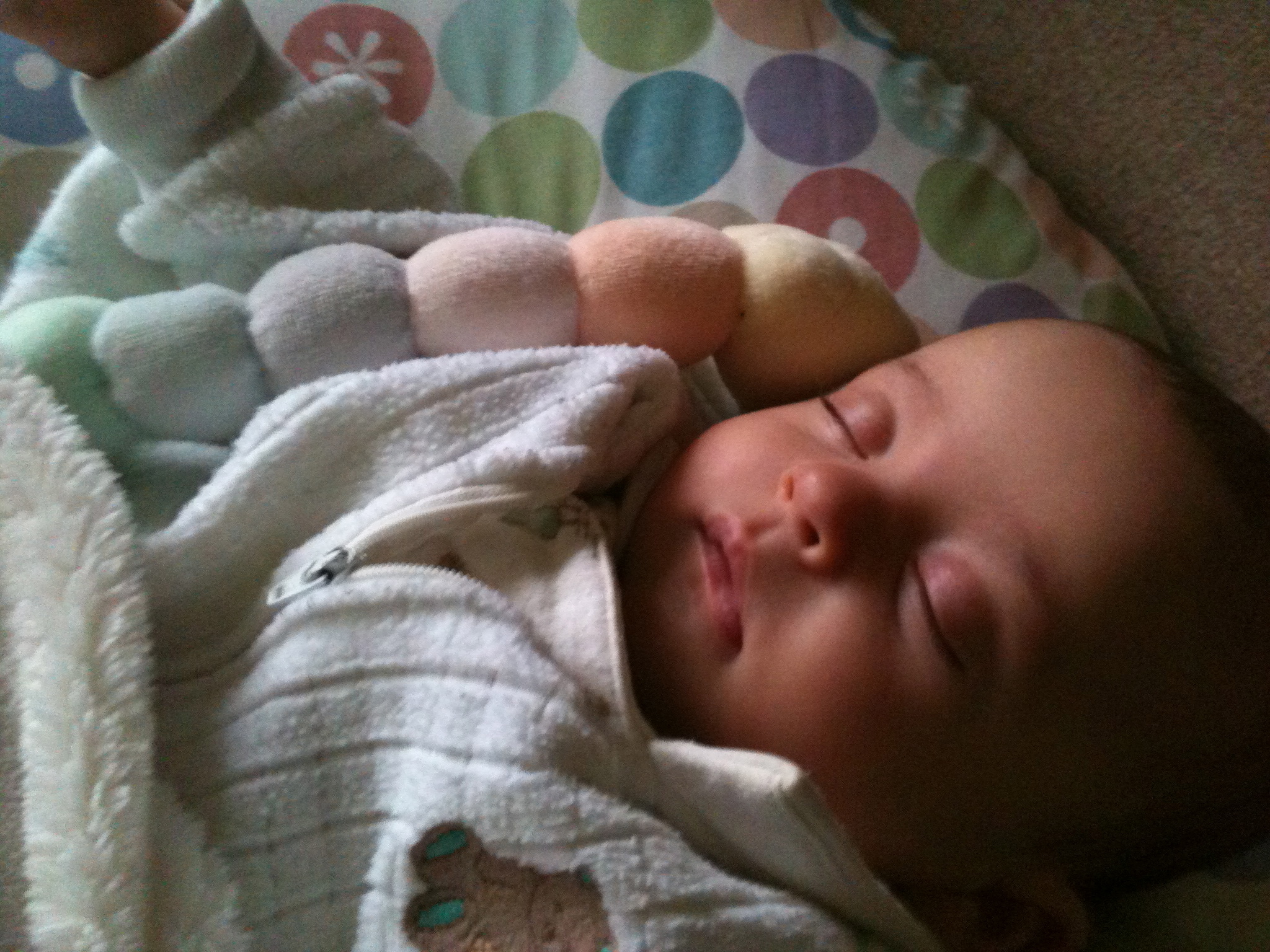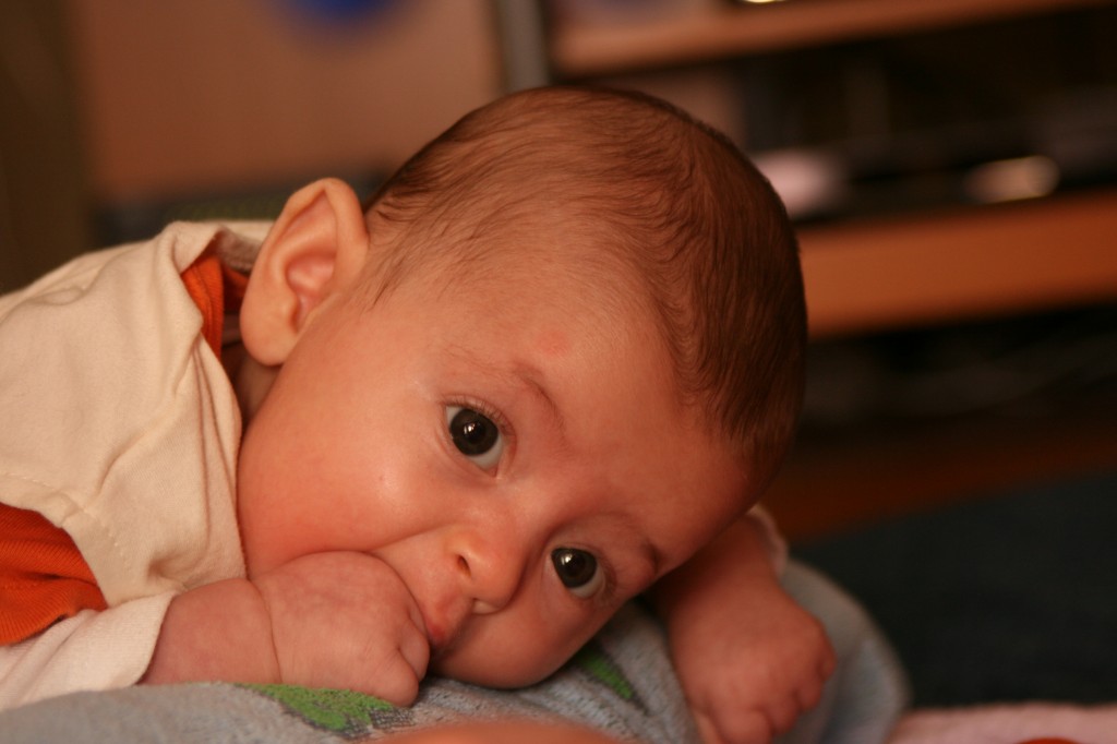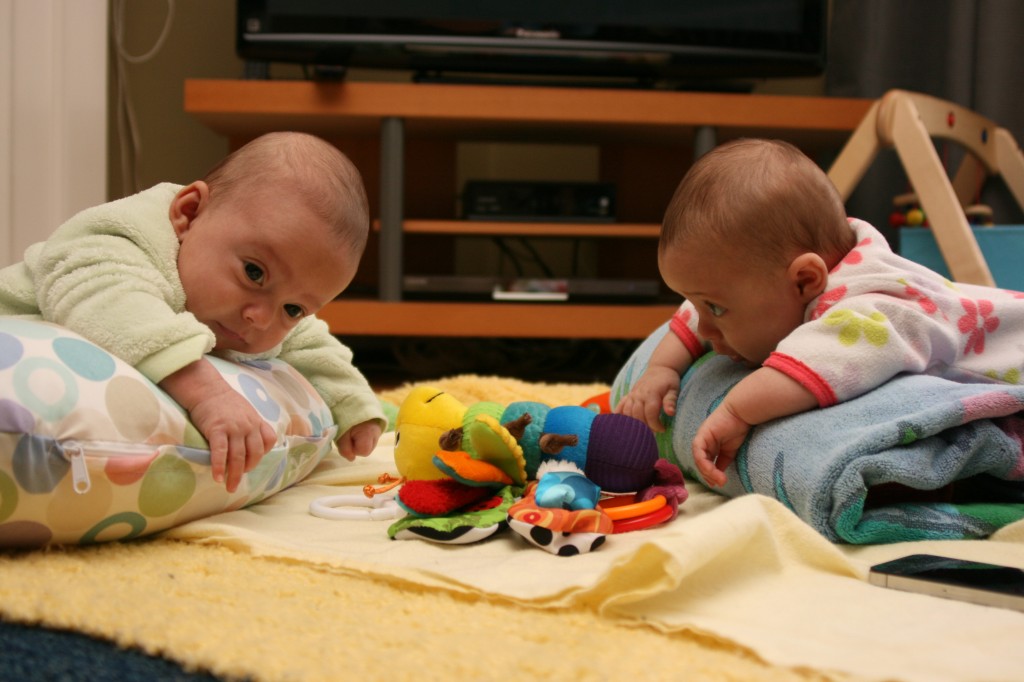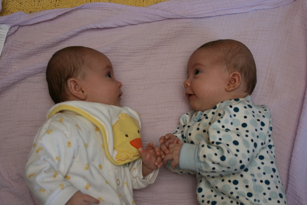 After getting their weight up to a point where we no longer had our attention on it, they went through a gassy/colicky phase, from about 6 to 9 wks old. Randomly, I started reading a sleep book in the early morning hours at my “pumping station”. I was astounded to learn that my children were sleep deprived. When they were newborns they could fall asleep anywhere, anytime but now they are no longer able (neurologically and developmentally) to fall asleep on their own. Given I didn’t know that, I just kept on hanging out with them all day, watching them cat nap, thinking they’d sleep when they were tired. Unfortunately, they became intensely sleep deprived. So, month three was all about sleep; getting them restored, learning to sleep and learning to stay asleep.