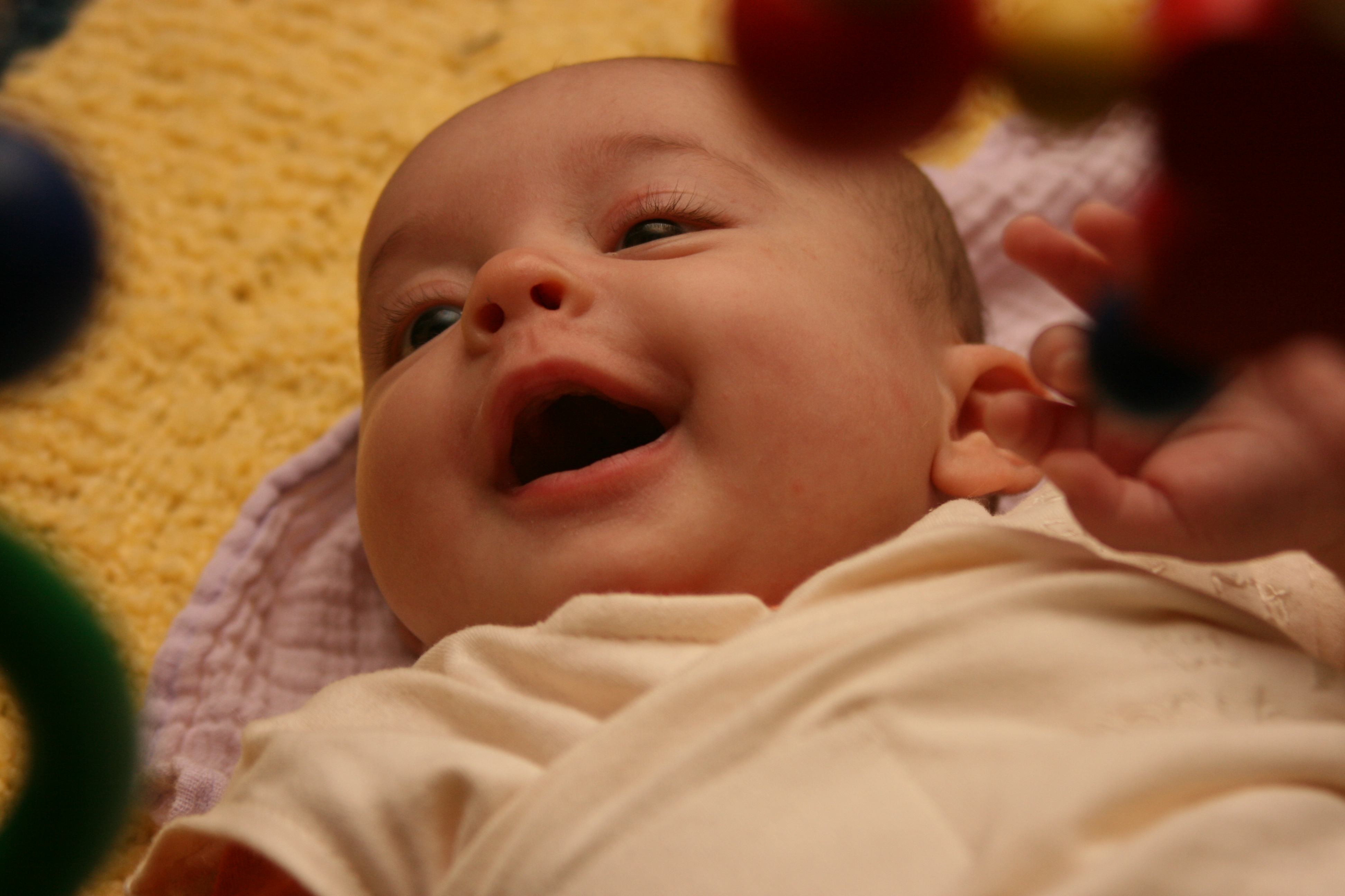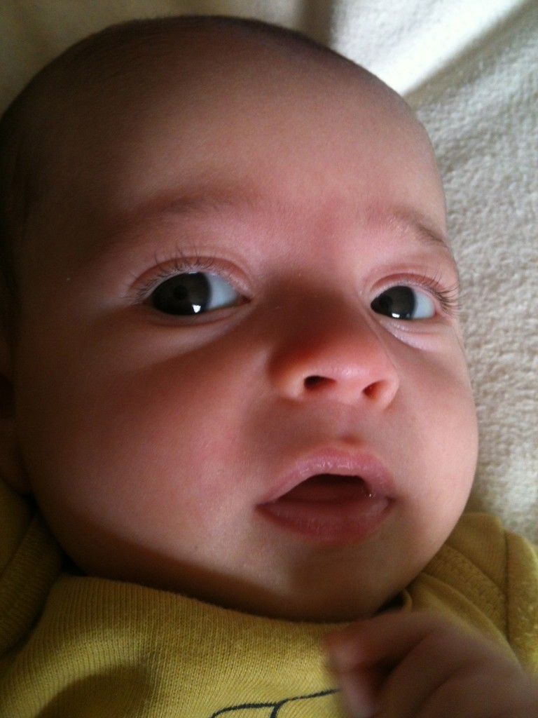 Their personalities are simply more intense versions of who they were when they were born. Callie is still loud and vocal and physically active. She is little but packs a big punch. On her three month visit she had her doctor jaw-dropped with how much she communicates. “Wow! This one really has a lot to say doesn’t she?” I truly can’t imagine where she gets that from (sheepish grin). Her eyes have not yet changed color but I’m pulling for them to stay the pretty green that they are. They are gorgeous eyes– though we don’t necessarily recognize the shape so we affectionally say she has “mystery eyes”.