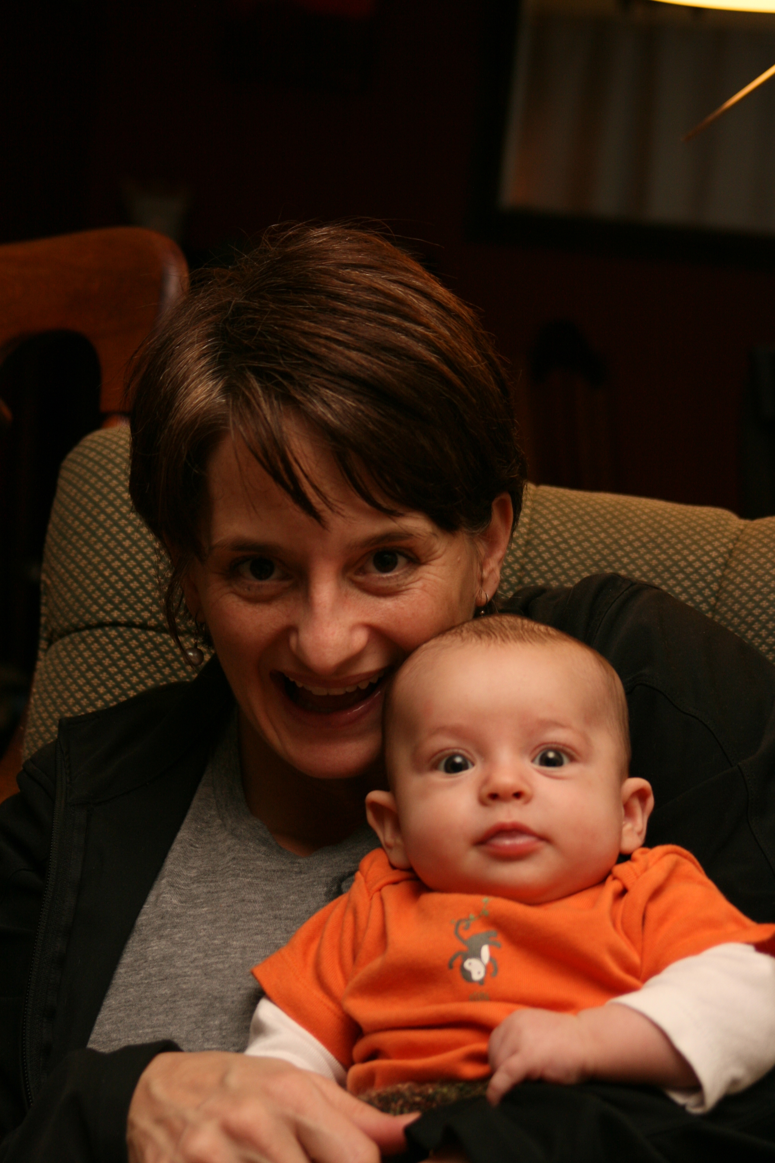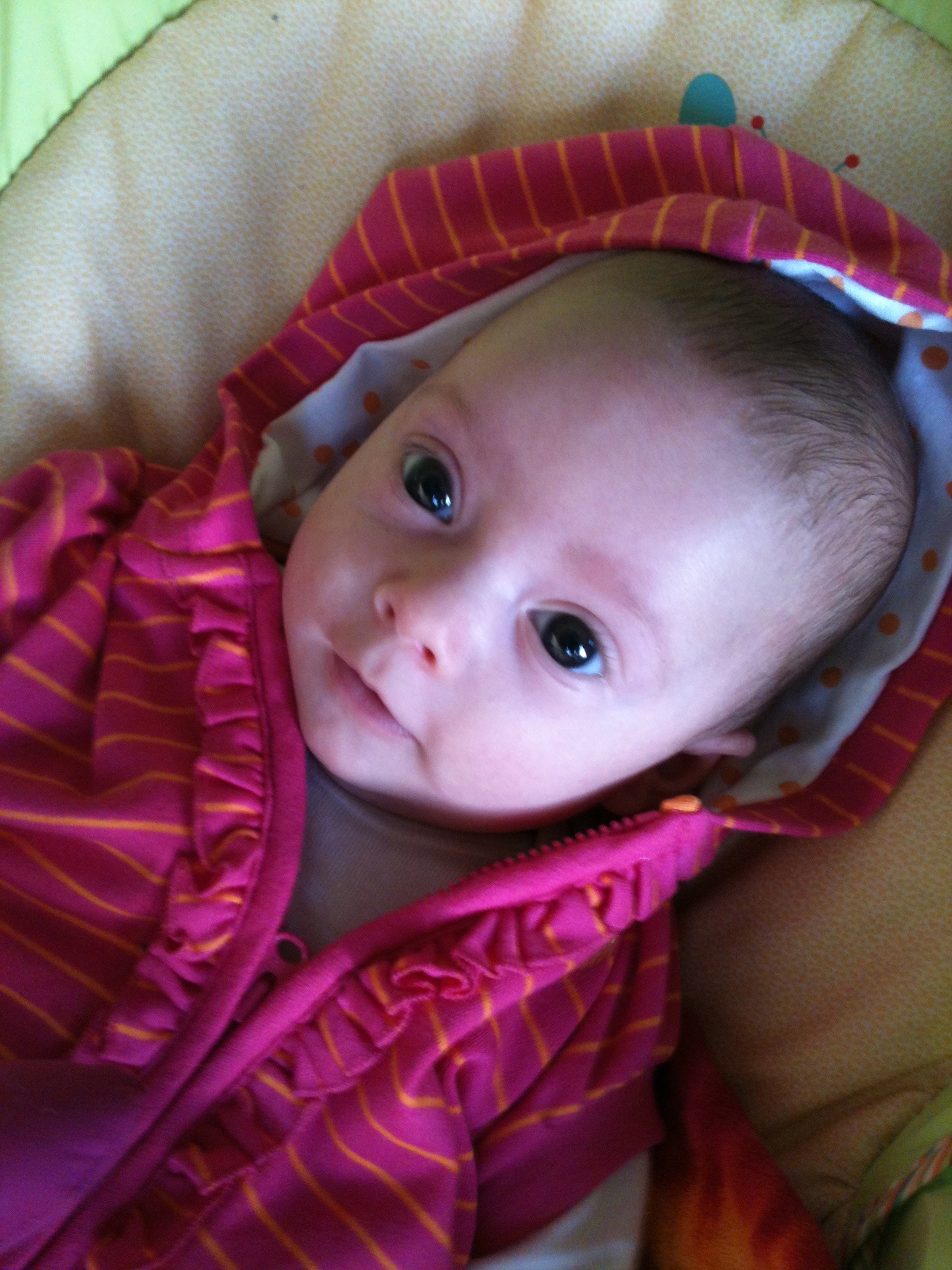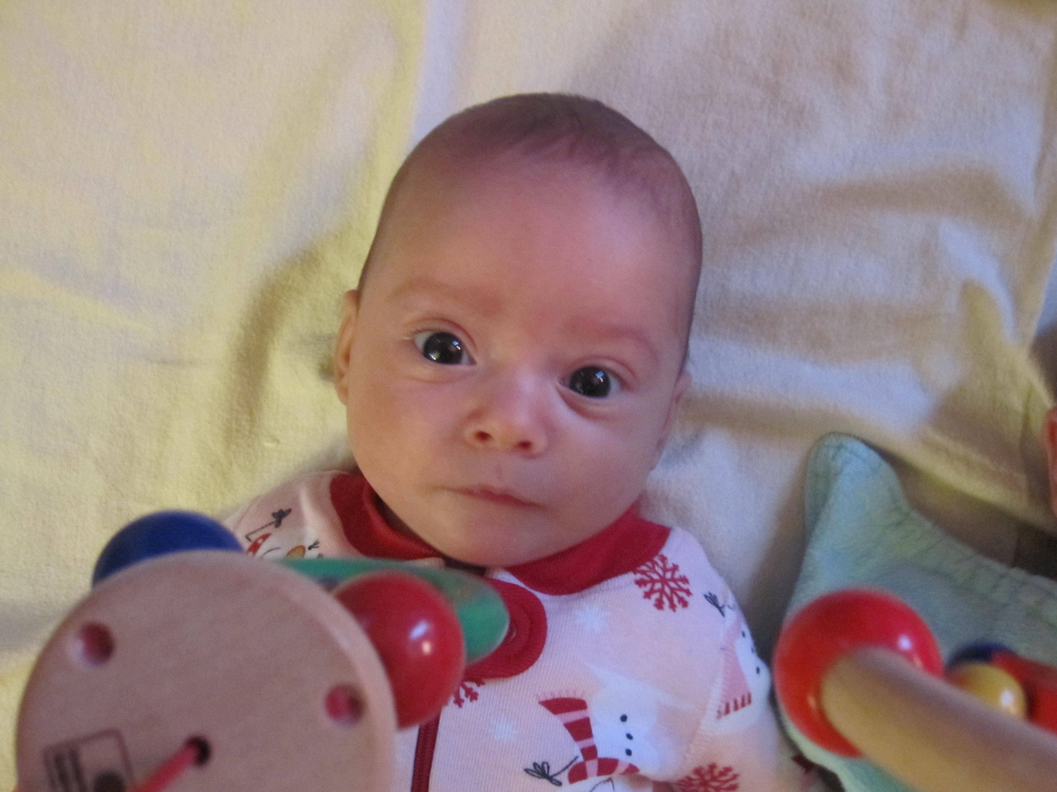 Genevieve continues to be peaceful, steady and sweet. She notices music start and stop now and she’s super aware of her surroundings. She wrings her hands–with those long fingers– all the time, either thinking or praying we’re not sure but it’s so damn cute we can’t get enough of it. She’s now out & out allergic to perfumes and frangrances (red watery eyes and nose, sneezing and fussy) but doc says she should grow out of it by year one. She also makes it really clear who she wants to be held by and who she does not. Even if it’s awkward, we do our best to support what she communicates give she can’t really say with words, “Hey, I’m not diggin’ on this person, could they not hold me please?” Genevieve has big brown eyes that are clearly from the Perata side of the family.
