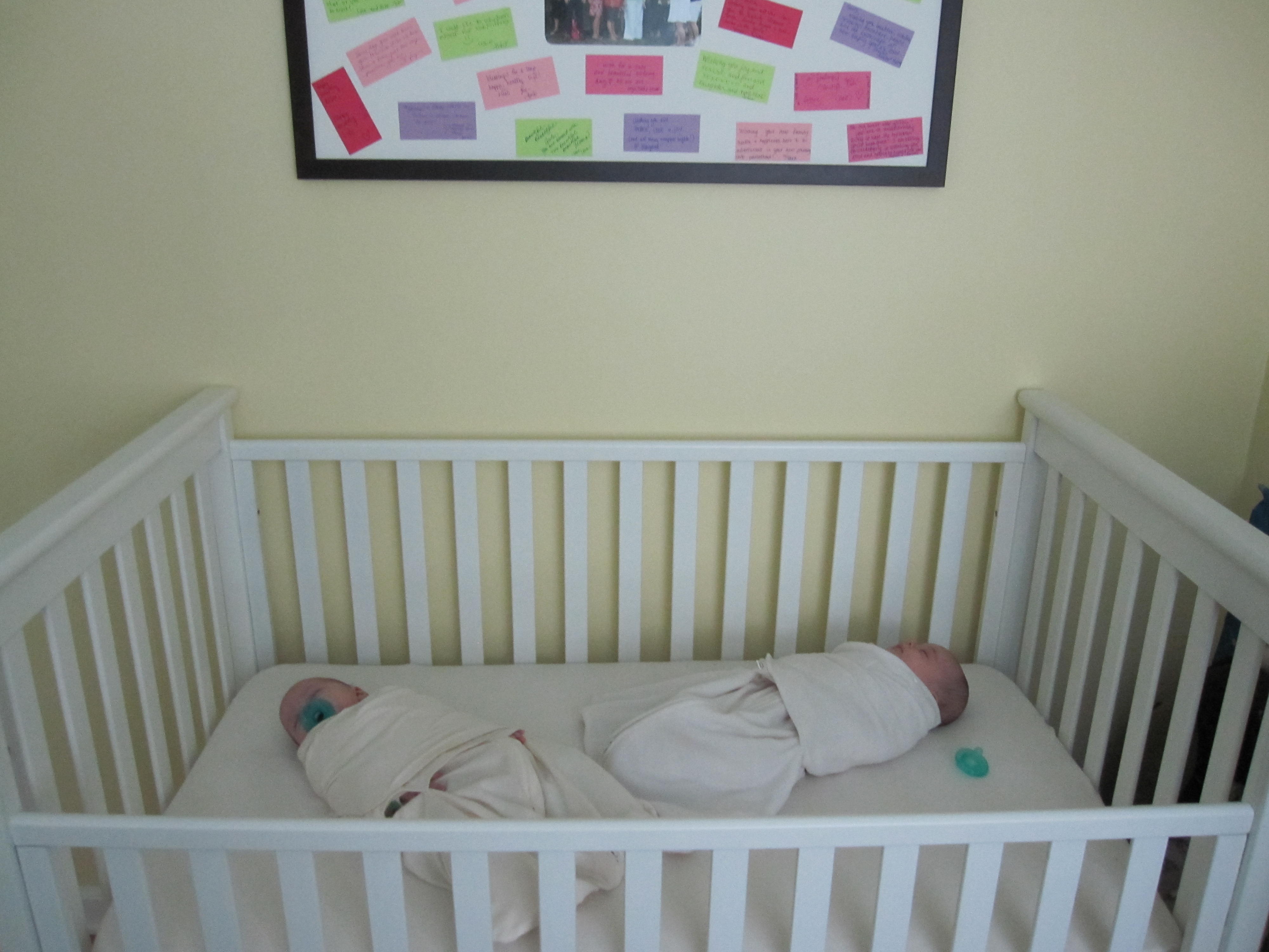 So, while it seemed crazy, I implemented a plan (based on a book called ‘The 90 Minute Sleep Cycle’ by an infant sleep scientist and mother) wherein every time upon waking in the daytime– no matter if they slept 20 minutes or 2 hours– they went back down 90 minutes later. They’d wake and (depending on what they needed) they’d get changed and fed and have play-time to stimulate their little brains and bodies and tire them out. Then they went back down with a sleep routine (music, dim lights, swaddle, rocking, same room) exactly 90 minutes later. In fact, the routine would start about 15-25 minutes before the 90min sleepy window so that by the time the 90-minute mark came I was already in the room and rocking and soothing and ready for them to nod off when that magic minute hit. The first time I tried it (was the first day I read the book… I was desperate), it worked like magic. I thought it was a fluke. I couldn’t believe it… I was literally jaw-dropped. Then, every time it happened I was still shocked. My girls were finally going down easily. No tears! None!