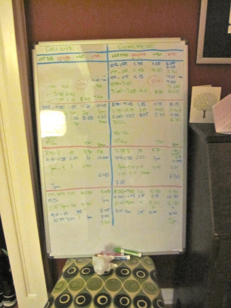 We took my white board that was in my now unused, vacant office wiped it clean and put it up in the dining room. On it we started tracking both the girls feed and sleep cycles (also in effort to keep them in sync). I bought some special swaddles, hooked up with some twin moms online about sleep stuff, set up their nursery and crib which we hadn’t been fully set up yet (they’d mostly been in our room). Then I got Gina onboard. When home on the first weekend to help with the whole thing she said, “This is crazy! Is this all our life is about now? Getting them to sleep? I miss our girls. They are sleeping all the time now.” But I insisted and book-marked pages for her to read on the importance of their sleep, setting the foundation for their sleep habits for the rest of their life and the science behind it all. A lover of sleep, in a matter of days she could see the girls were happier to be around when awake, night times became easier as the girls were clearly suffering less. Plus, there was no denying the magic of holding a baby and watching her eyes magically close and nod off spot on the 90min mark. She was sold and we stuck with it.