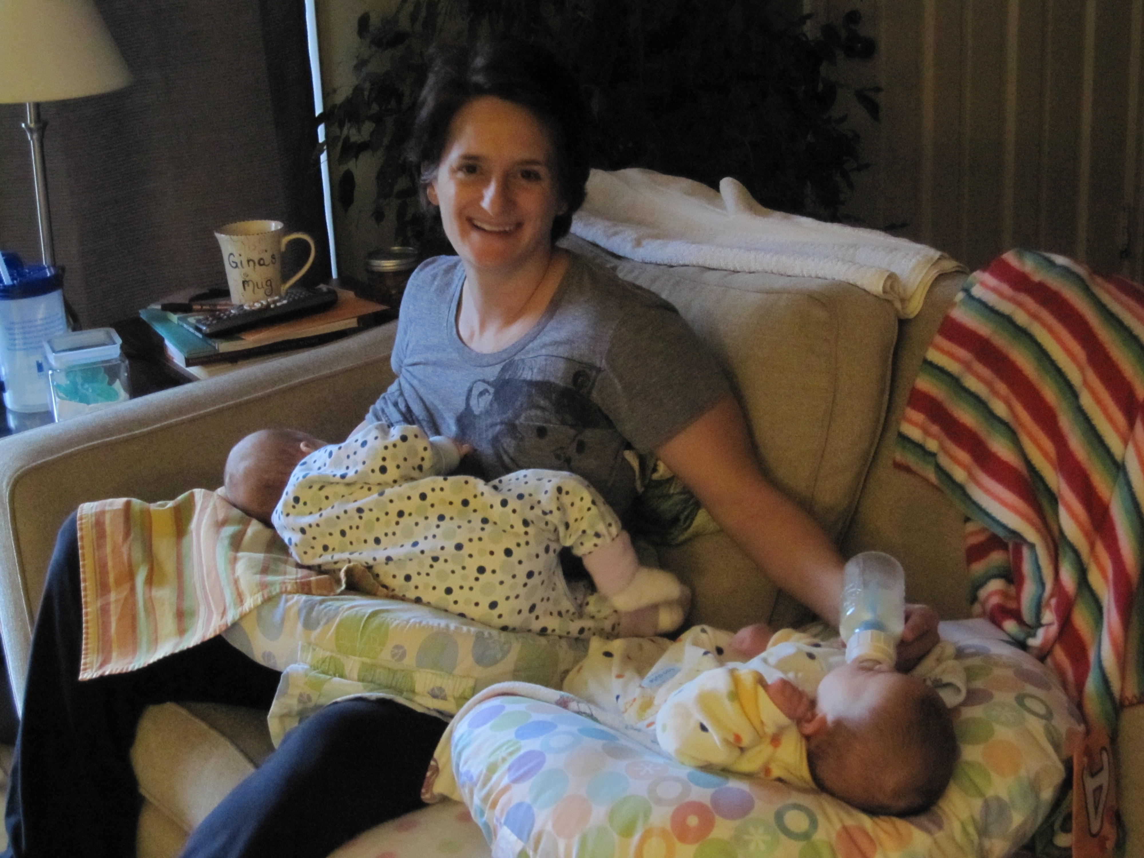 Genevieve is still on the nipple shield, and given how my nips are shaped, she just may always be… but, we still try every feeding. I finally gave up on tandem feeding. The fantasy of it is way sweeter than the reality. It’s fricking hard and I hated it. Once they are older and can hold their heads up better, we’ll try again in some different positions and maybe it’ll be easier. For now, they take turns and if both are hungry at the same time, I put a Boppy next to me, put the baby in the Boppy and bottle feed her while I breast feed the other. “Tandem” is simply altered a bit. We are all much happier.