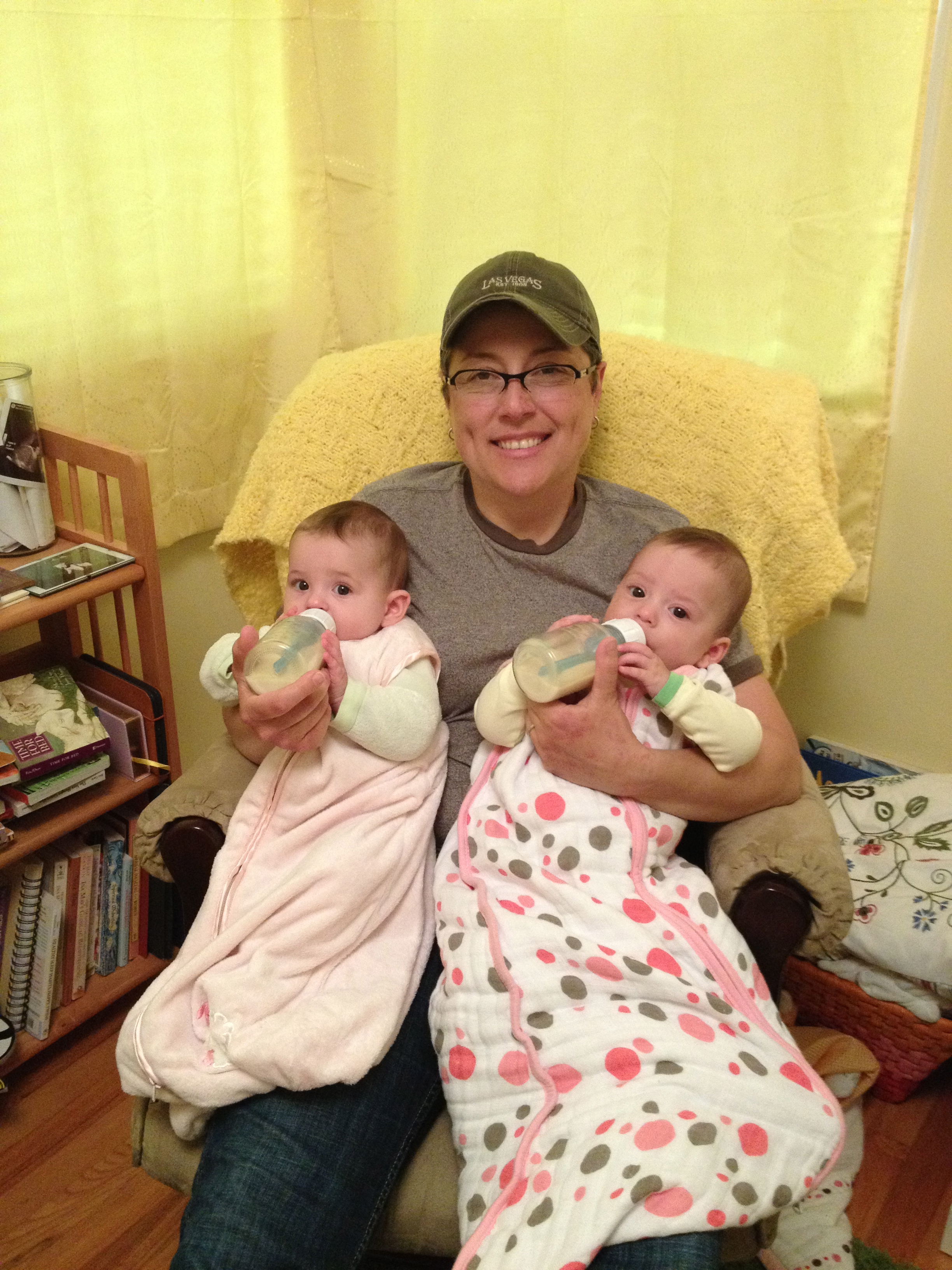 We make bottles of breast milk combined with goats milk formula, change diapers and change into comfy jammies. If I’m solo I put them both in a crib and feed them both bottles. If Gina is home I hold them in the rocker and feed them bottles (and I’ll nurse Genevieve) while Gina reads and signs their favorite books to them. Then we each burp them, turn off all the lights, turn on the sound and wave machines and set them in their cribs. We soothe them a few minutes and then tip-toe out of the room. We sometimes have to go back in a few times to help them fully fall out. Or, sometimes, if one baby isn’t quite ready to sleep, we put her in our room so she can she flop around and make noise if she wants.