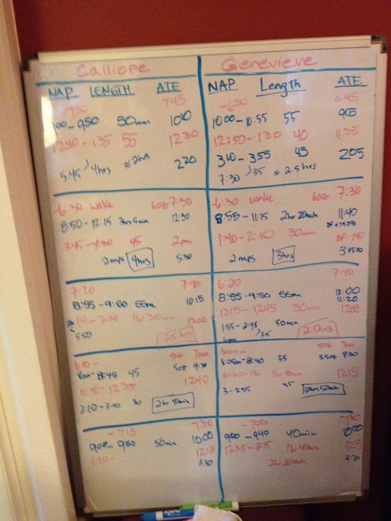 I went back out to the white board we keep and sure enough, their naps were getting longer in the morning and afternoon but were spotty, still. Hmm. Could that really be why Callie wasn’t sleeping at night? I wondered what would happen if they didn’t sleep from 2pm-6pm (bedtime). I couldn’t imagine them being awake 4+ hours! But, seemed like it was worth a try to support them and see what happens.