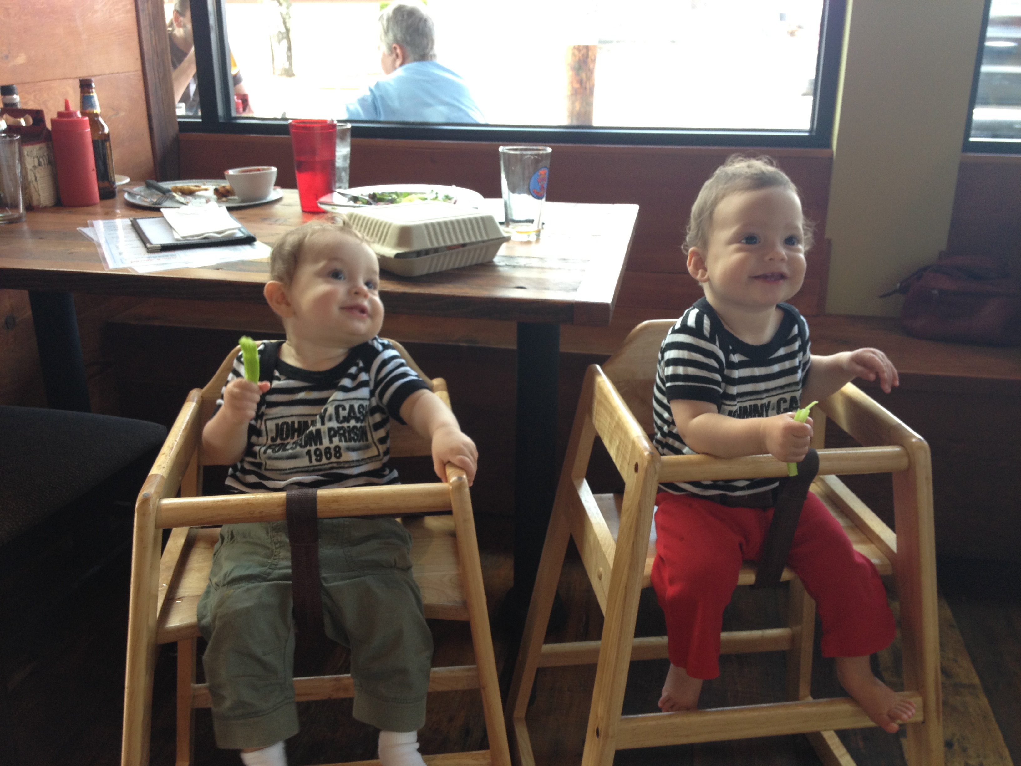 Out to eat (a rare occasion) wearing their Johnny Cash shirts from Auntie Laura Cash.