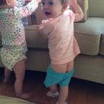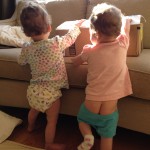 Favorite past times include unfolding and tossing around laundry as well as dipping into the diaper basket and throwing the diapers everywhere! They also like to stand on the couch and look out the window at the birds on the wire, flying and pecking for food. They love letting the chickens out in the morning and of course petting that cats (which they’ve learned to do gently). They get so much joy from these things.