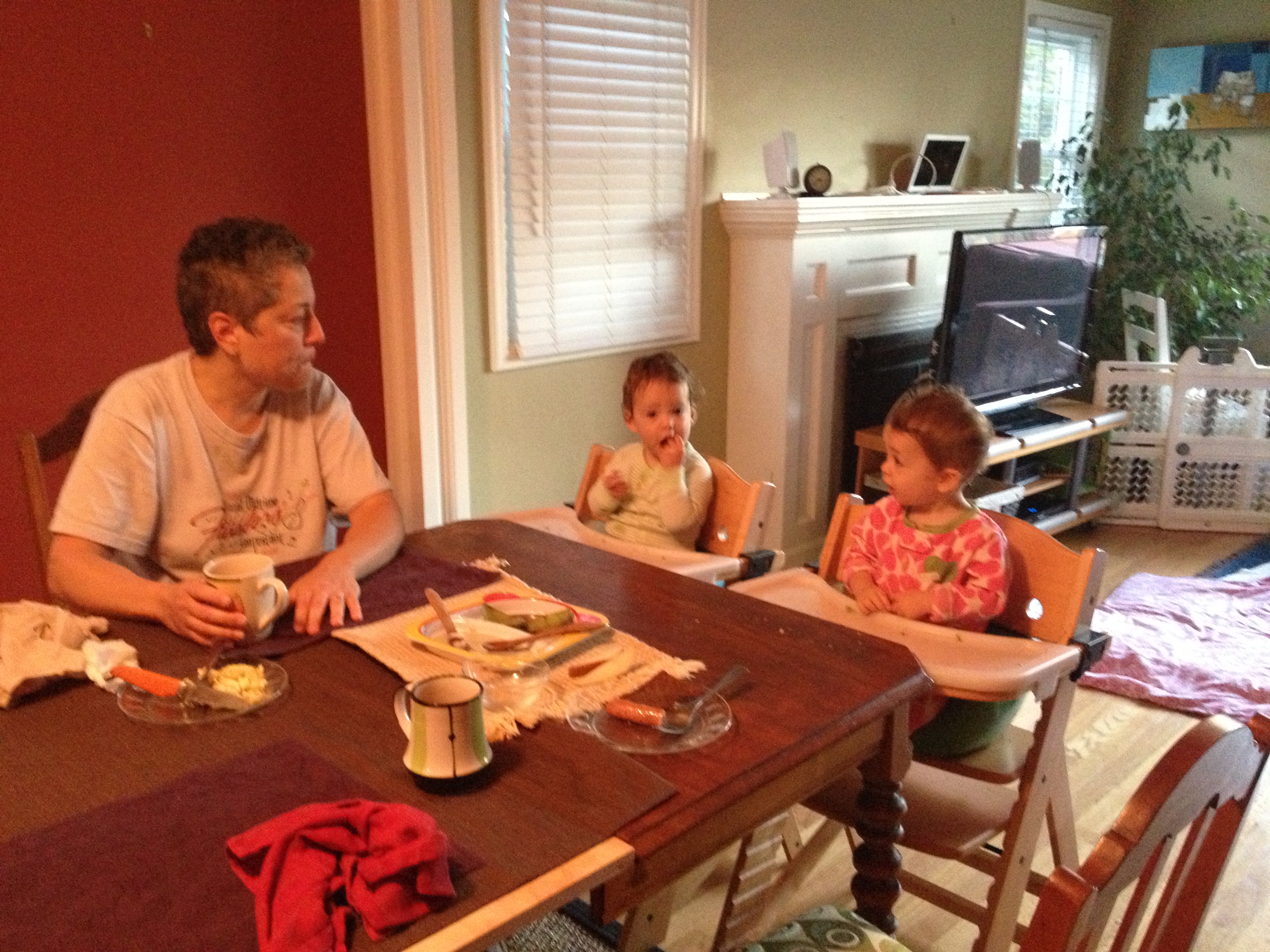 Eating breakfast at the table.