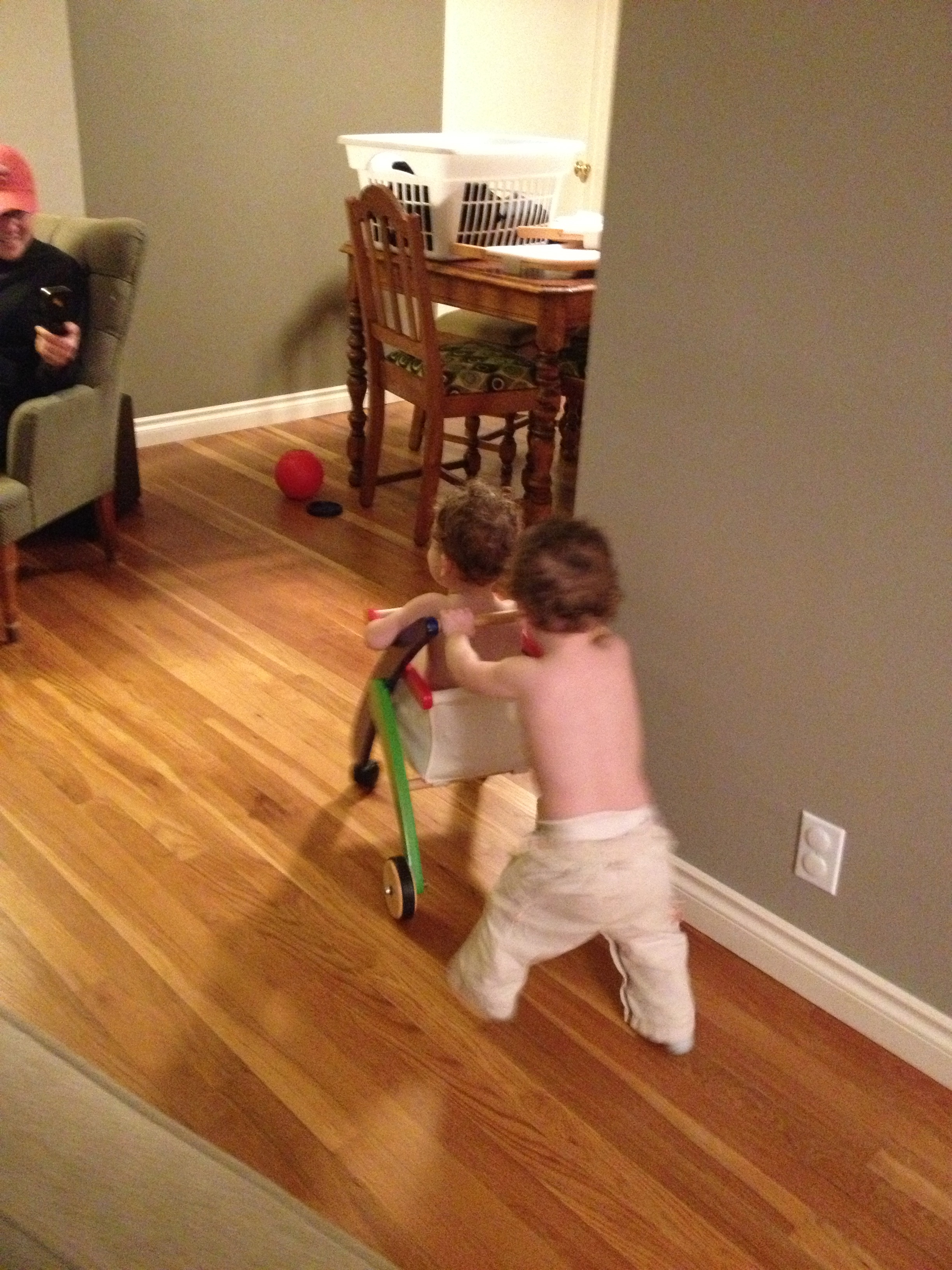 G’s favorite thing is to push her sister around by any means she can. Calliope willingly obliges.